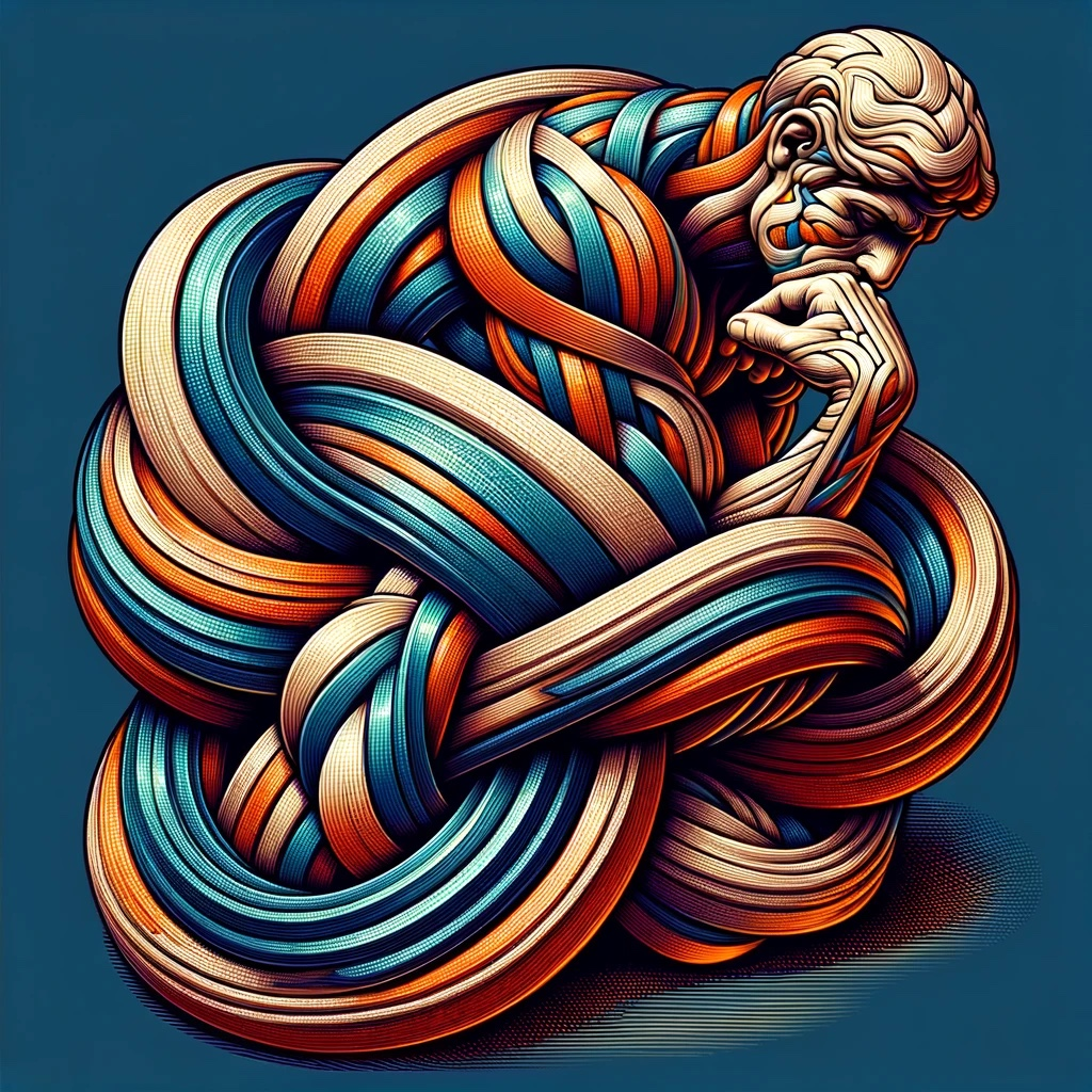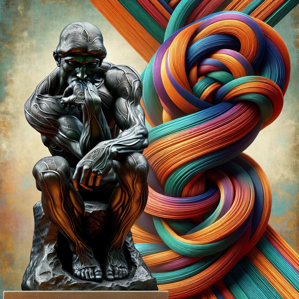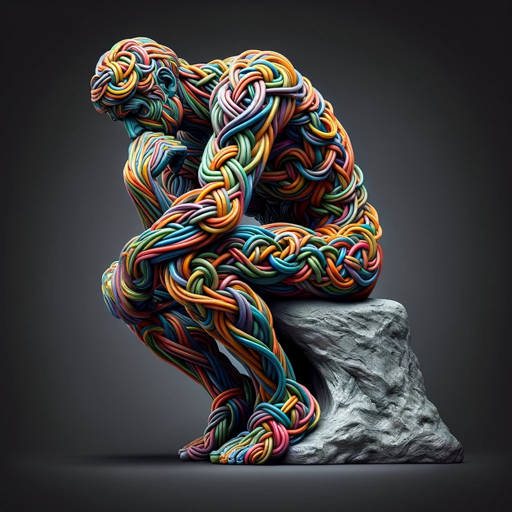 The image indeed takes inspiration from “The Thinker,” a famous sculpture by Auguste Rodin, typically representing deep contemplation. The Gordian knot aspect adds a layer of complexity, symbolizing an intricate problem or situation that is difficult to solve, which aligns well with the original sculpture’s theme of profound thought. It’s a creative blend of classical art with a modern twist to convey a sense of intellectual struggle or complexity.